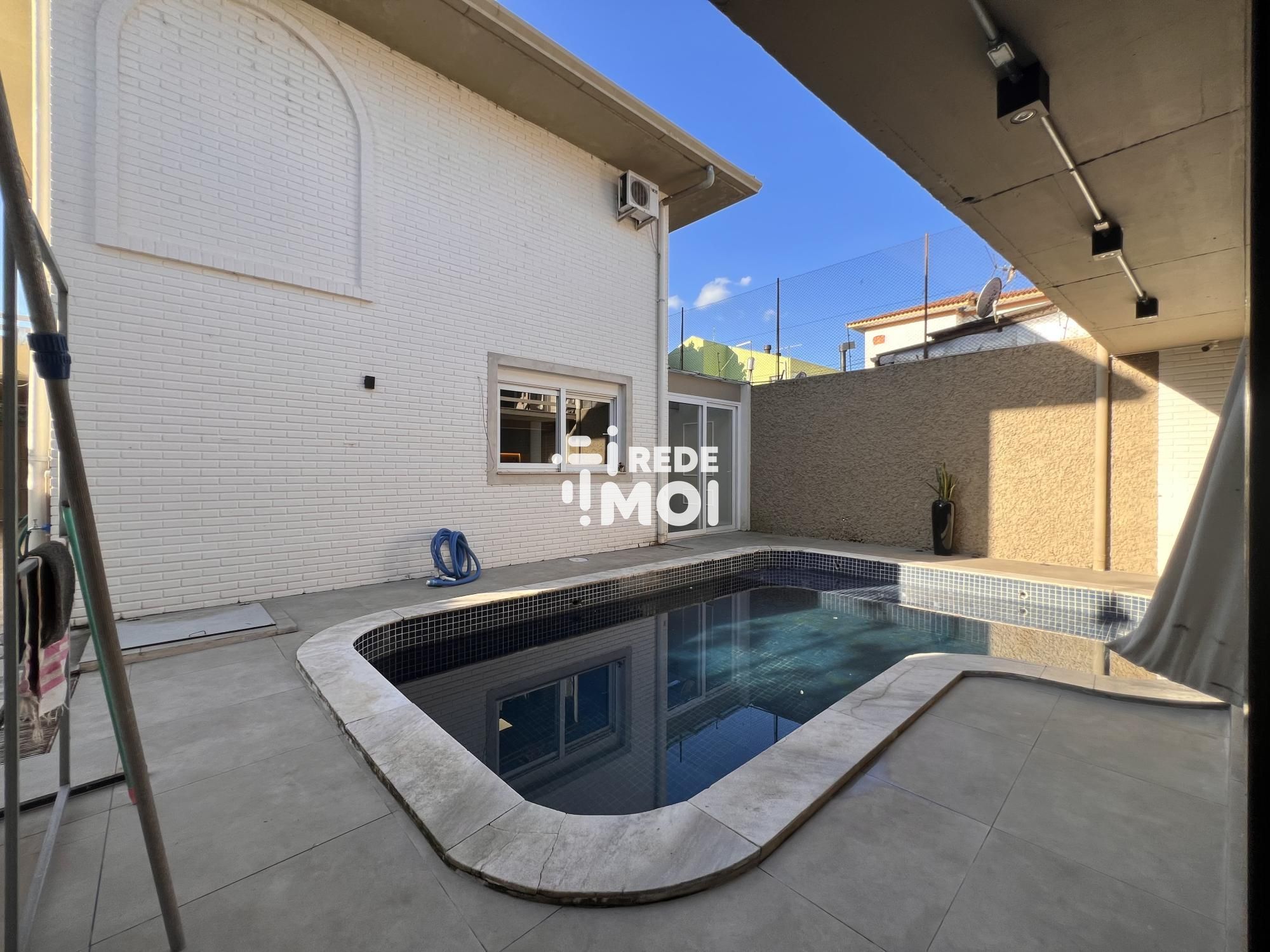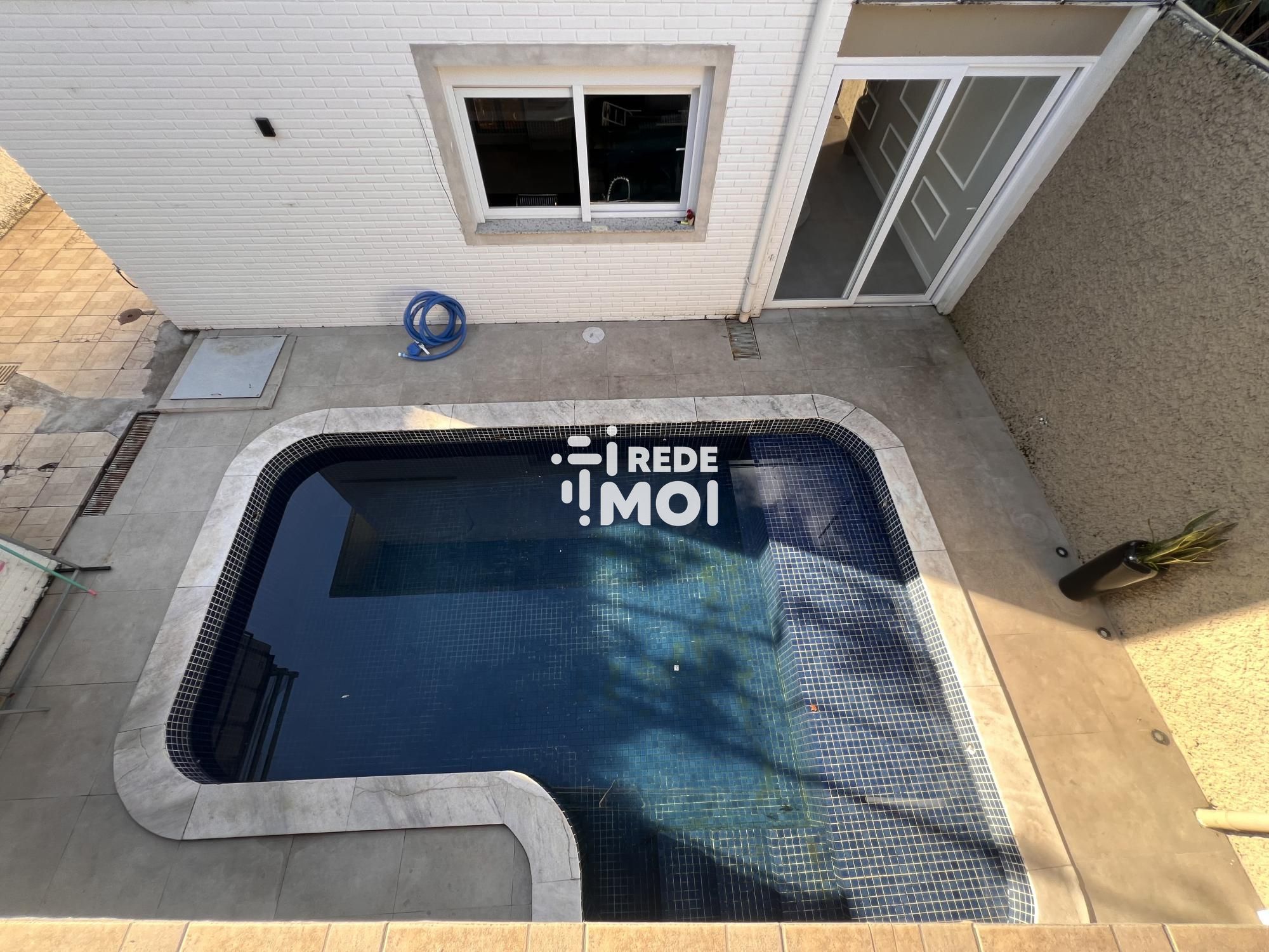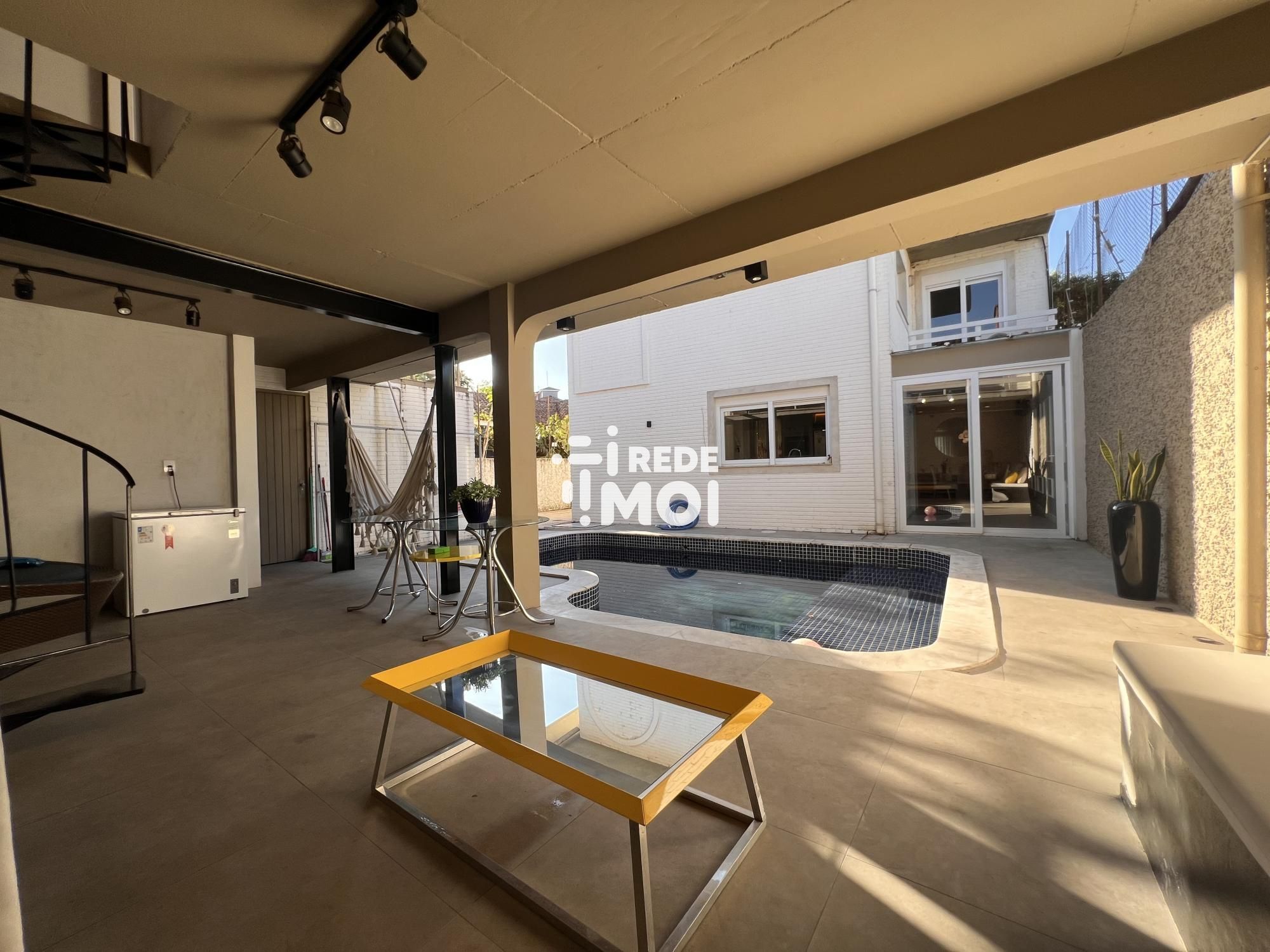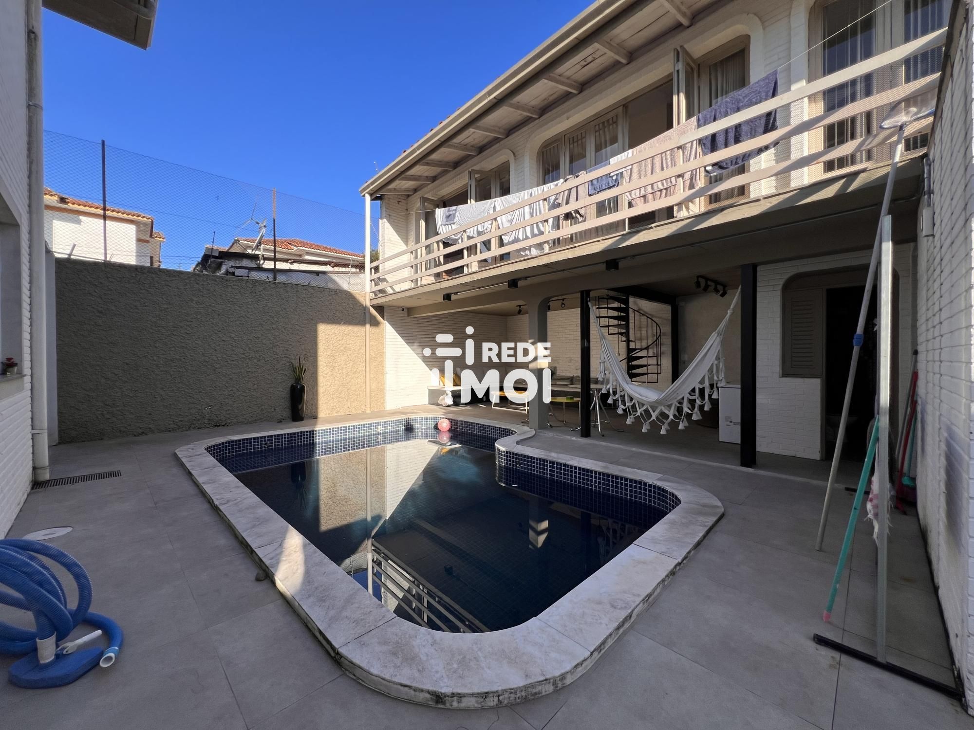 1º Pavimento: Sala de estar com lareira, sala de jantar, lavabo, área de serviço e vaga para 4 carros. A propriedade também conta com uma edícula com área gourmet junto à piscina.